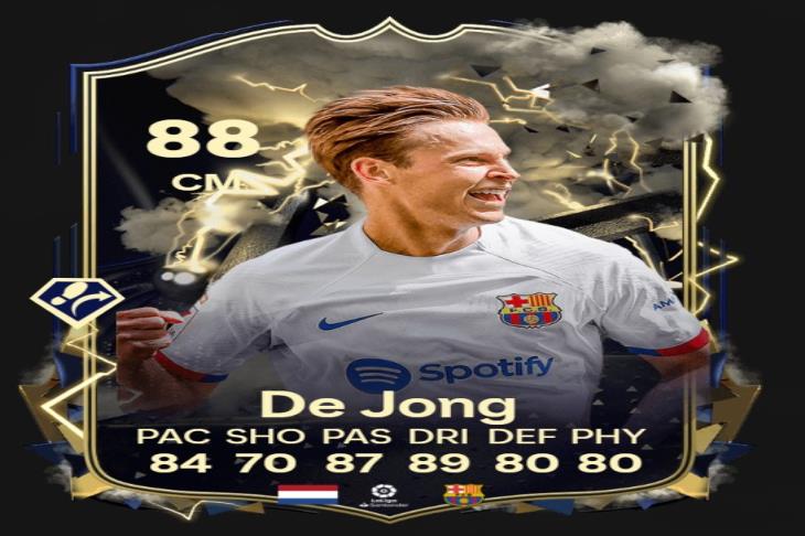 توافرت بطاقة الهولندي فرينكي دي يونج خط وسط برشلونة الإسباني في تحديات لعبة FC24 بطاقات 88.