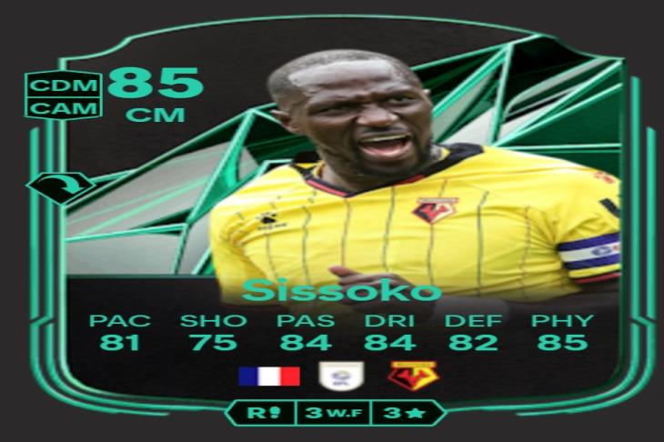 توافرت بطاقة اللاعب الفرنسي موسى سيسوكو، لاعب وسط فريق واتفورد الإنجليزي، بتقييم 85 في لعبة FC 25.