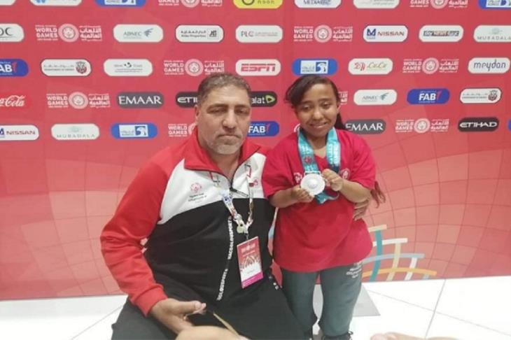 أهلة سيد مع ميداليتها الفضية ومدربها