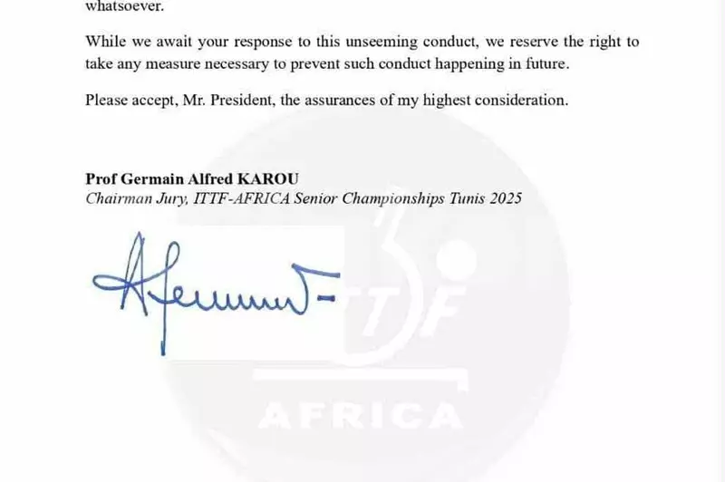 "وعليه، يوجه الاتحاد الأفريقي لكرة الطاولة هذه الرسالة إلى الاتحاد المصري لكرة الطاولة للتعبير عن احتجاجه الشديد، ويطلب منكم اتخاذ جميع الإجراءات اللازمة لضمان عدم تكرار مثل هذا الحادث مستقبلاً."