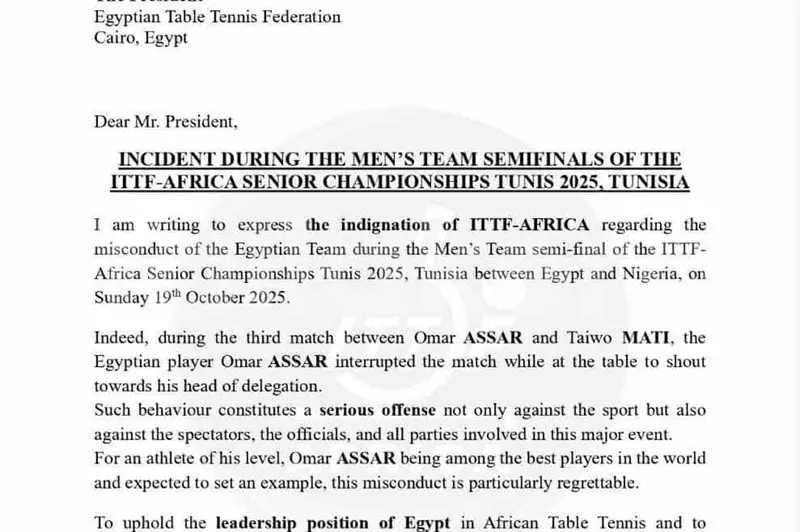 "أتوجه إليكم بهذه الرسالة لأعبر عن استنكار الاتحاد الإفريقي لكرة الطاولة (ITTF-AFRICA) بشأن السلوك غير اللائق الصادر عن فريقكم الوطني خلال مباراة نصف نهائي فرق الرجال في بطولة إفريقيا للكبار لتنس الطاولة – تونس 2025، والتي جمعت بين منتخبي مصر ونيجيريا يوم الأحد الموافق 19 أكتوبر 2025."