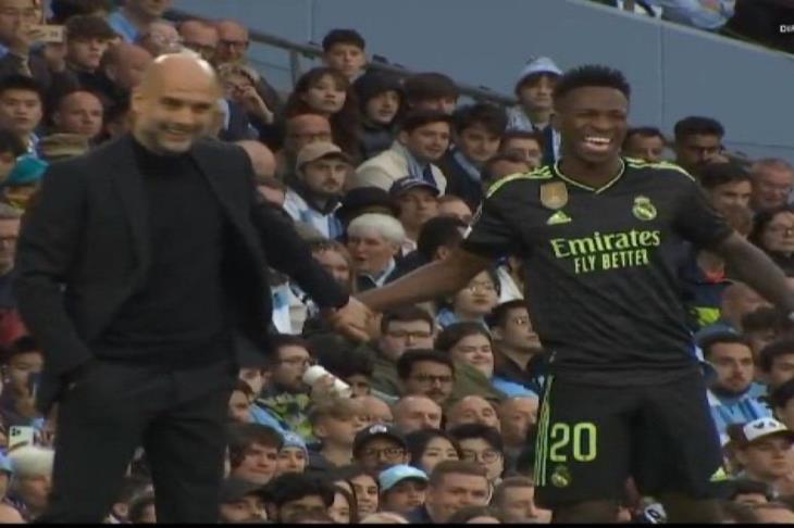 شهدت مباراة مانشستر سيتي وريال مدريد، أمس الأربعاء، حوارات جانبية بين فينيسيوس جونيور نجم الفريق الملكي ومدربه كارلو أنشيلوتي، وأيضا مع بيب جوارديولا المدير الفني للفريق السماوي.