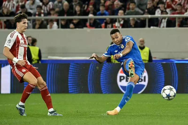 تسديدة قوية من لاعب أولمبياكوس تصطدم في قدم أحد لاعبي ريال مدريد وتخرج إلى ركنية