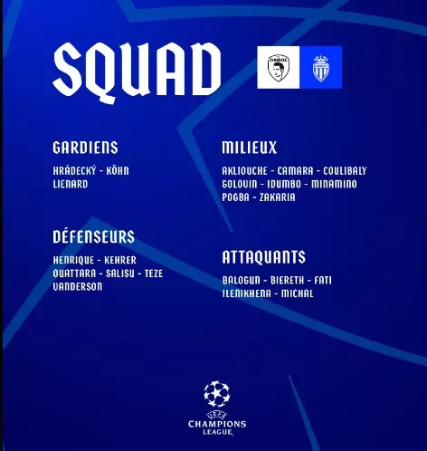 واختار سيباستيان بوكونيولي، المدير الفني لموناكو، 22 لاعبا لخوض المباراة، حيث كان من بينهم بوجبا، الذي سجل ظهوره الأول في الملاعب بعد غياب طويل خلال لقاء الفريق ضد رين بالدوري الفرنسي، يوم السبت الماضي.