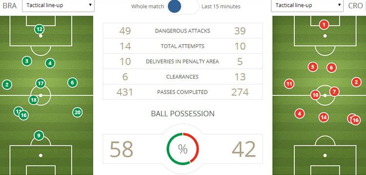 سيطر المنتخب البرازيلي بشكل أكبر من نظيره الكراوتي على الكرة طوال أوقات المباراة بنسبة 58% مقابل 42% لمنتخب كرواتيا.